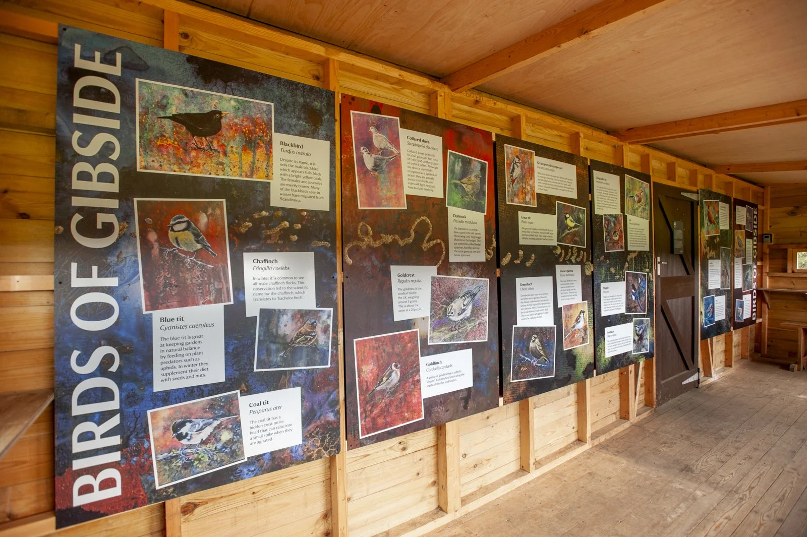 Following on from the panel designs, we went on to work alongside a local artist to create a series of graphic boards for the new birdhide at Gibside. These boards used a mix of typography and the artist’s paintings to a colourful and vibrant display giving vistors information on some of the birds local to the area.