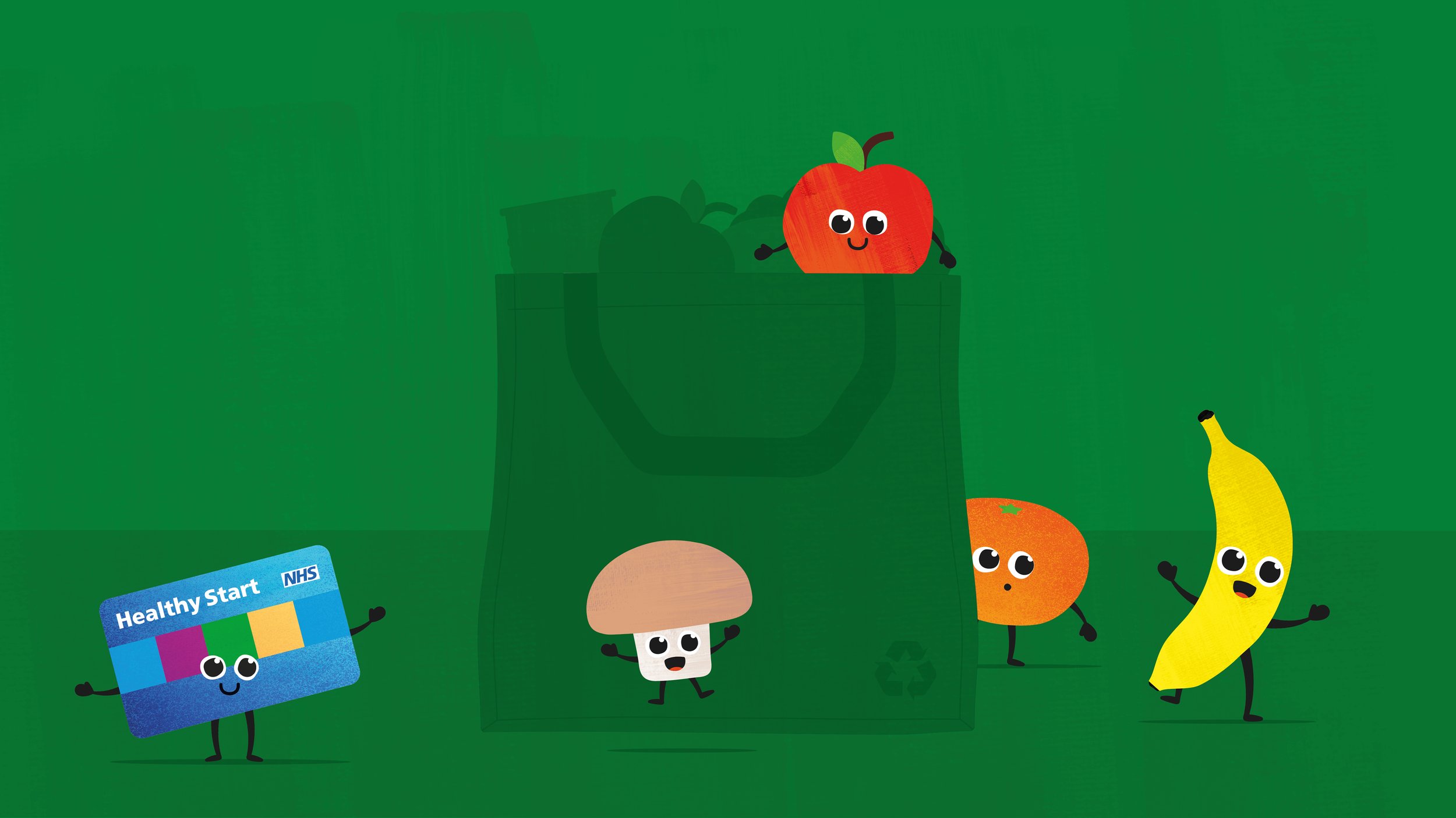 Following a discovery session with NHSBSA we developed a group of illustrated characters based on the types of food available through the scheme using the Healthy Start Prepaid Card. The characters were designed to create a friendly and approachable tone, be understandable to a non-English speaking audience and be visually impactful and memorable on social media channels.